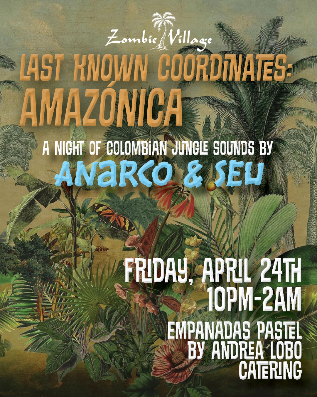 Last Known Coordinates: Amazónica is a night of Colombian jungle sounds deep inside Zombie Village — curated by Anarco & Seu, two artists known for weaving cumbia, tropical bass, and Amazonian folk into something that feels ancient and completely alive at the same time.