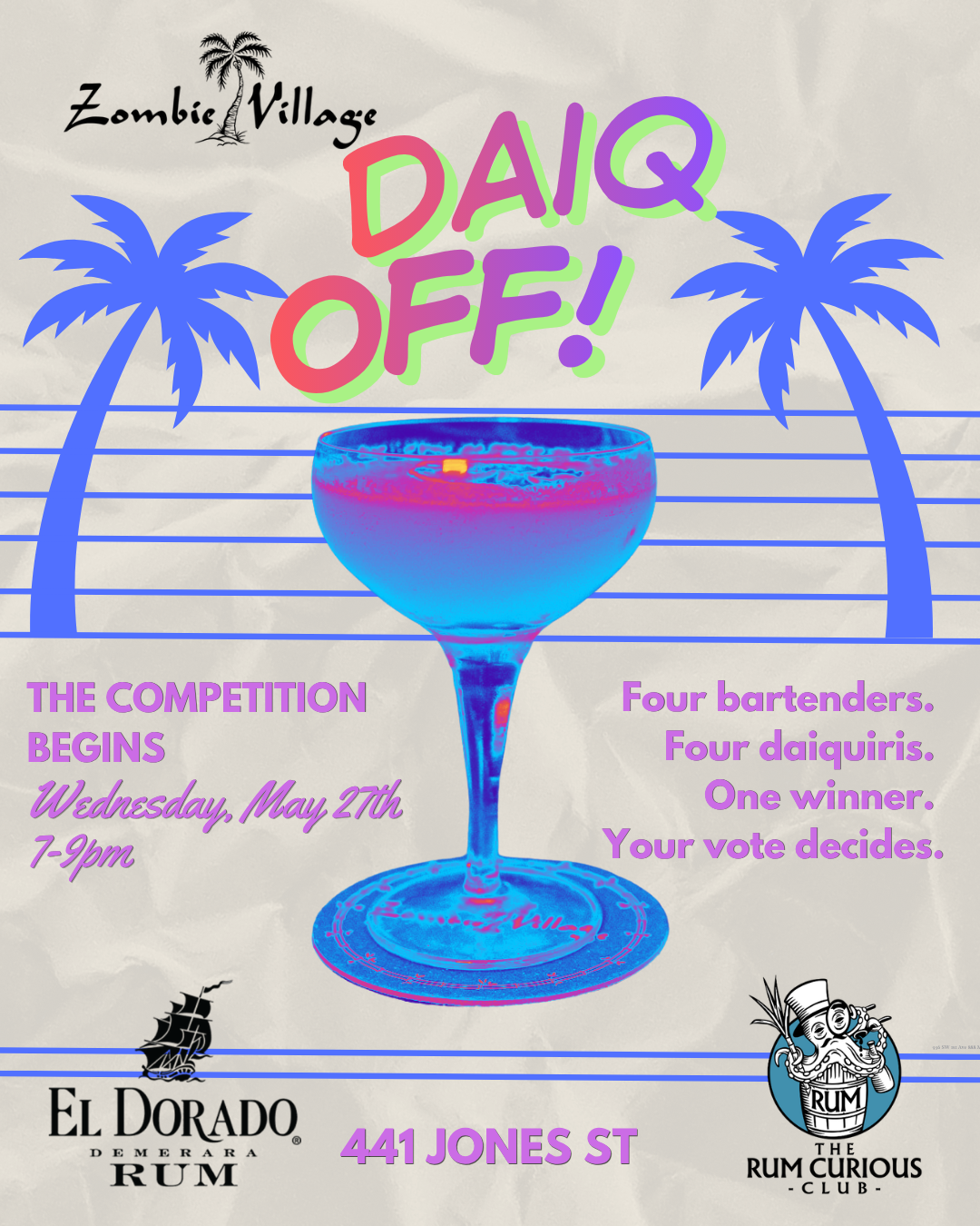 On Wednesday, May 27th from 7–9PM, Zombie Village invites you to the Daiq Off! — a blind daiquiri throwdown with four bartenders, four daiquiris, and one judge: you. Each bartender has crafted their own creative riff on the classic daiquiri, prepared in advance so you can taste, compare, and deliberate without distraction. Cast your vote, and find out if your palate holds up when the labels are hidden.